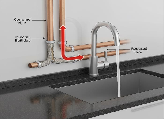 - Mineral Buildup (Scale): In regions with “hard water” (high mineral content), calcium and magnesium deposits slowly coat the inside of pipes, like cholesterol in an artery. Over years, this can dramatically reduce the pipe’s internal diameter, starving your faucets of water.