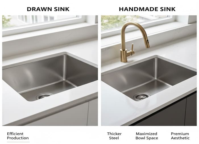 The value proposition is clear: With drawn sinks, you pay for efficient production. With handmade sinks, you pay for thicker steel, maximized bowl space, and a premium aesthetic.
