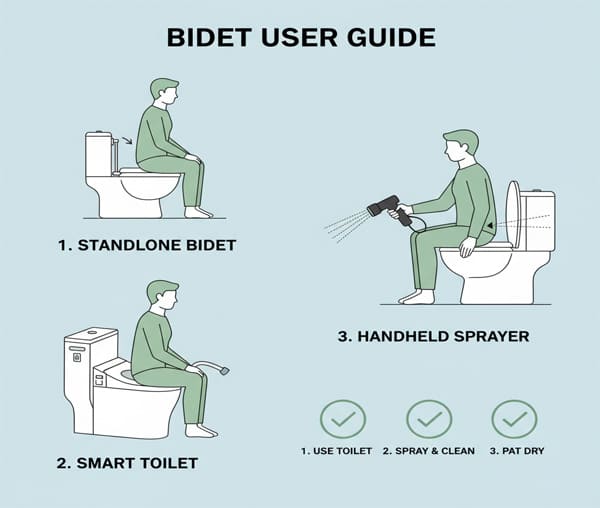 - Step-by-step instructions on how to use a standalone bidet, a smart toilet, and a handheld sprayer.