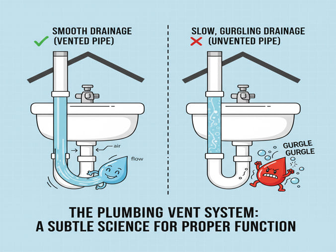 Expert Insight: Think of the vent system as the plumbing’s “lungs.” Without it, the drain system can’t “exhale” displaced air or “inhale” to break vacuums, leading to gurgling drains, slow drainage, and dangerous sewer gas entering your home.